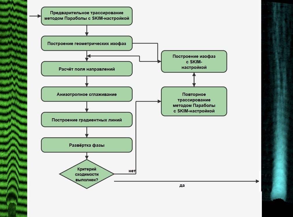 Рисунок 1. Схема итерационного процесса восстановления фазы в рамках фреймворка WISP. Алгоритм начинается с предварительной трассировки темных полос на исходной интерферограмме (пример показан справа). Затем он входит в итерационный цикл, включающий построение линий равной фазы (изофаз), вычисление локальных направлений полос, анизотропное сглаживание для подавления шума и, наконец, развертку фазы. Ключевым элементом является проверка сходимости: если результат недостаточно точен, система использует полученную информацию для более точной трассировки полос и запускает новый цикл уточнения. Процесс завершается, когда достигается максимальное соответствие модели реальному изображению. Источник: IEEE Access. Рисунок был переведен с помощью Claude Sonnet 4.