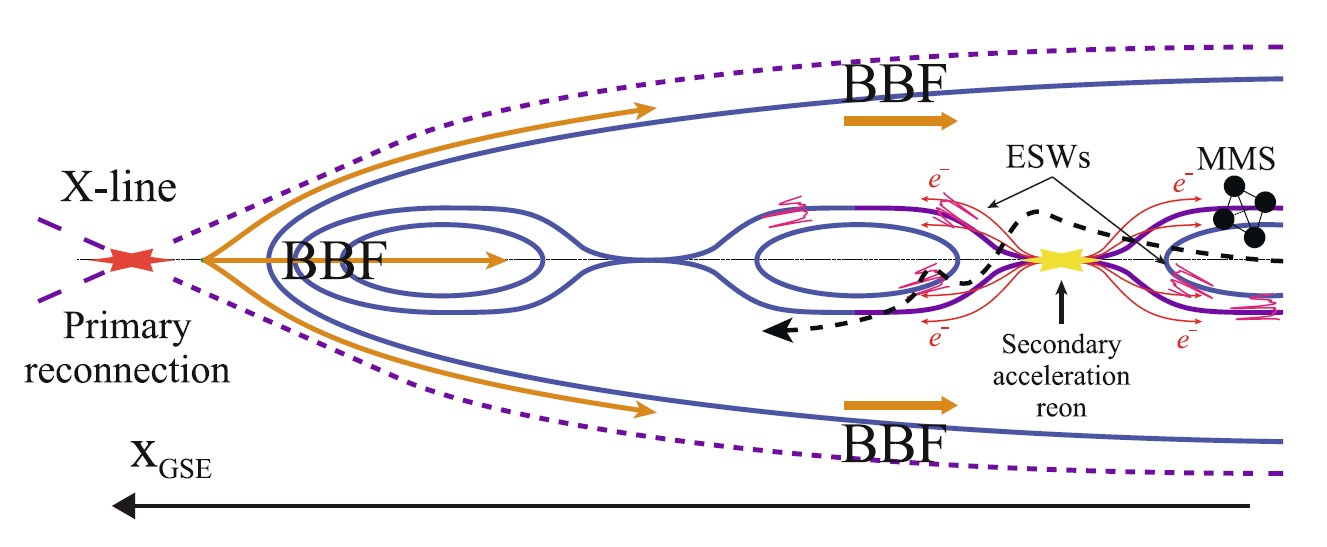 Рисунок 1. Каскад энергии в хвосте магнитосферы Земли. Схематическое изображение показывает, как энергия, высвобожденная в области первичного магнитного перезамыкания (слева), создает мощные потоки плазмы (BBF, оранжевые стрелки). Внутри этих потоков, далеко от основного источника, спонтанно формируются вторичные области ускорения частиц. Здесь возникают пучки ускоренных электронов (красные стрелки) и связанные с ними интенсивные электростатические волны (ESW, розовые линии), которые служат маркерами этих скрытых событий. Траектория спутников MMS (черный пунктир) проходит как раз через одну из таких вторичных зон, что и позволило ученым сделать свое открытие. Источник: JETP Letters, 2025.