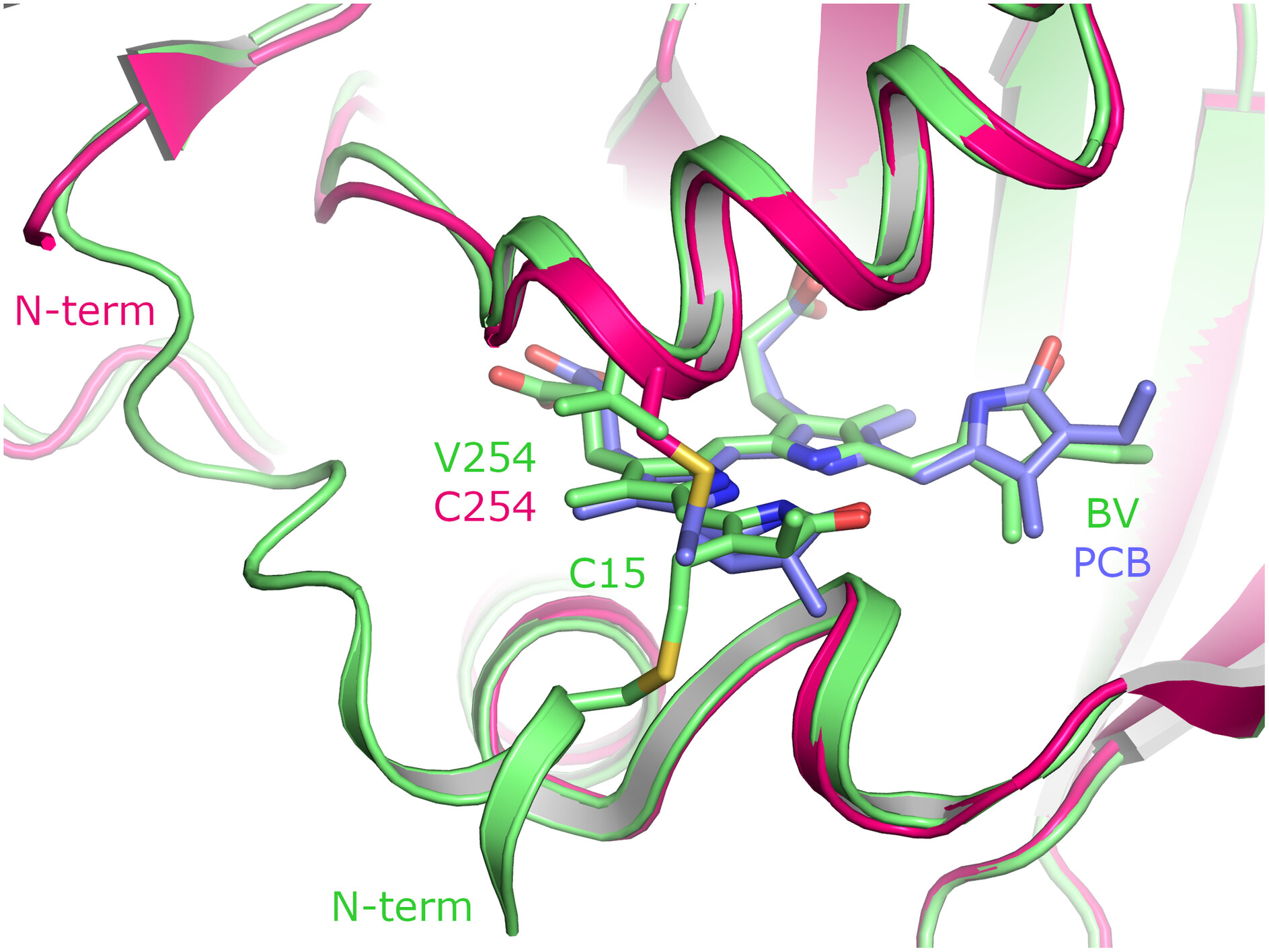 Сравнение комплексов мутантного белка iRFP713/C13S/V254C с биливердином (BV) и фикоцианобилином (PCB). Источник: The FEBS Journal