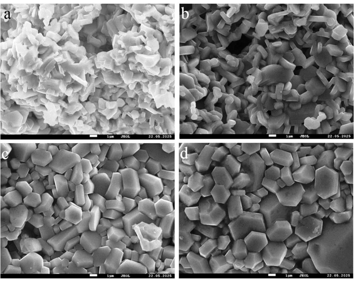 Рисунок 2. Изображения поверхности образцов, полученные методом сканирующей электронной микроскопии. Марганец-замещенный гексаферрит бария синтезирован из реакционной смеси с массовой долей монооксида марганца (%): 3,08 (a), 6,19 (b), 9,32 (c), 12,47 (d). Источник: Results in Chemistry