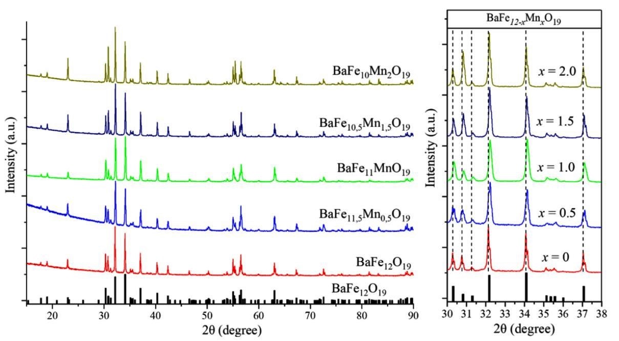 Рисунок 3. Рентгенограммы недопированного и марганец-замещенного гексаферрита бария. Литературные данные (черная линия) представлены для сравнения. Источник: Results in Chemistry