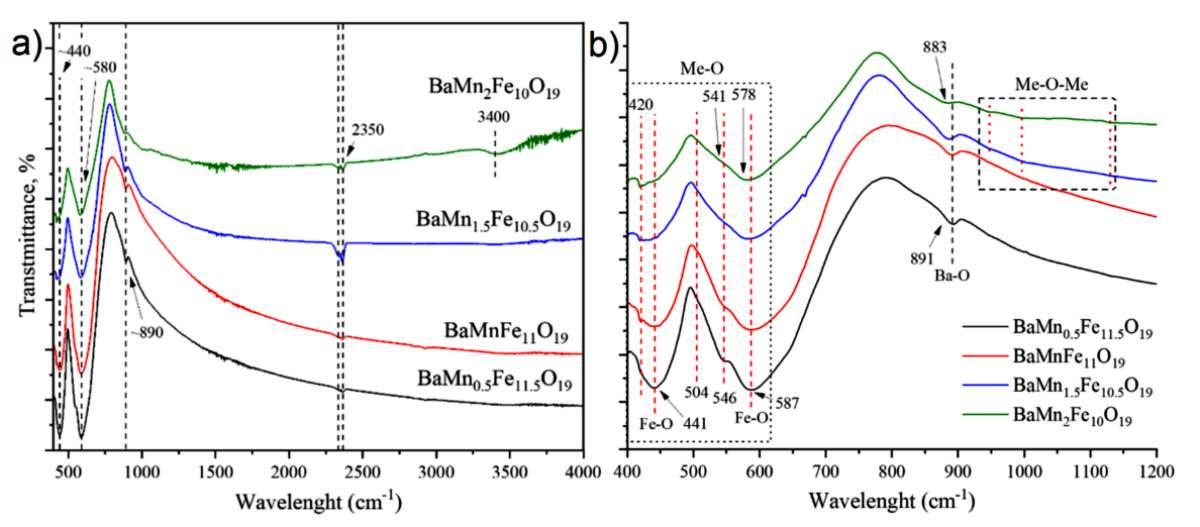 Рисунок 4. Инфракрасные спектры марганец-замещенного гексаферрита бария в широком (a) и узком (b) диапазоне длин волн. Источник: Results in Chemistry