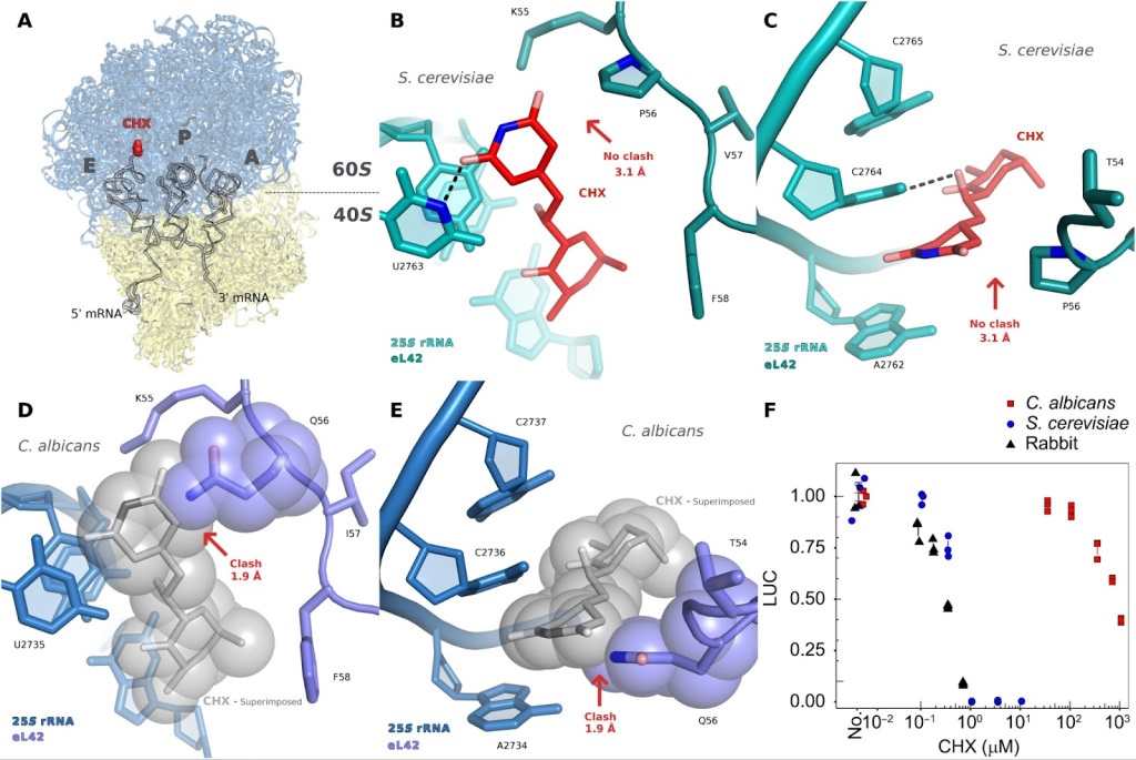 Q56 предотвращает связывание CHX с рибосомой C. albicans. Глутаримидная группа CHX сталкивается с боковой цепью Q56, что предотвращает связывание CHX с рибосомой C. albicans. Источник: Science Advances