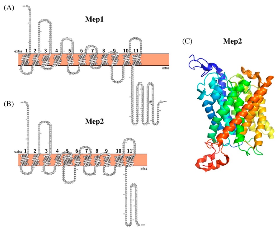 Схематическое изображение вторичной структуры Mep1 (A) и Mep2 (B). Кристаллическая структура Mep2 Candida albicans. Источник: Biomolecules