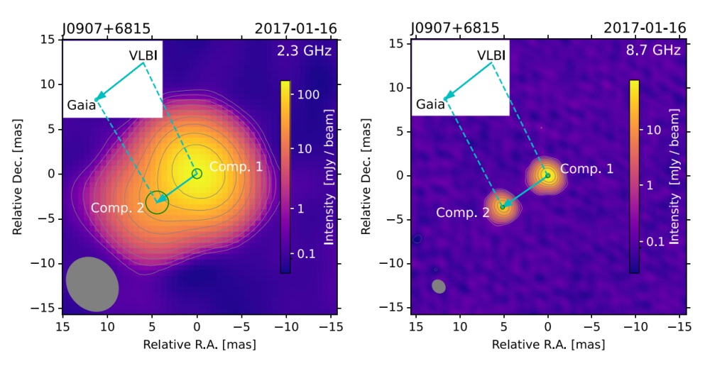 Но когда исследователи сравнили данные оптического телескопа Gaia и радиоинтерферометров со сверхдлинной базой (Radio Fundamental Catalogue), оказалось, что примерно в 10% случаев положения квазаров в оптическом и радиодиапазоне различаются. Это объясняется тем, что в разных диапазонах в излучении квазара доминируют разные части его сложной структуры, состоящей из джета и аккреционного диска.