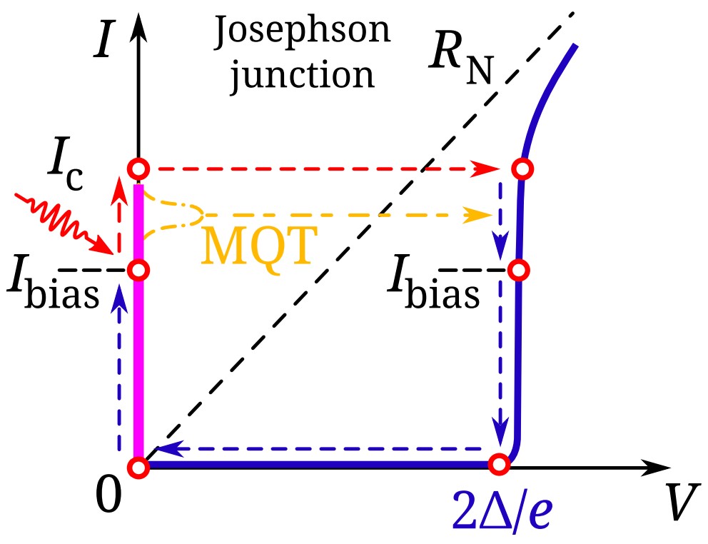 Рисунок 1. Принципиальная схема однофотонного детектора на основе джозефсоновского перехода — ключевой технологии эксперимента CASH. В рабочем состоянии (синяя линия) детектор находится в сверхпроводящем режиме. Поглощение одного-единственного фотона, рожденного из аксиона темной материи, вызывает скачкообразный переход в резистивное состояние с ненулевым напряжением (красная пунктирная линия), что позволяет надежно зарегистрировать событие. Источник: Physical Review D