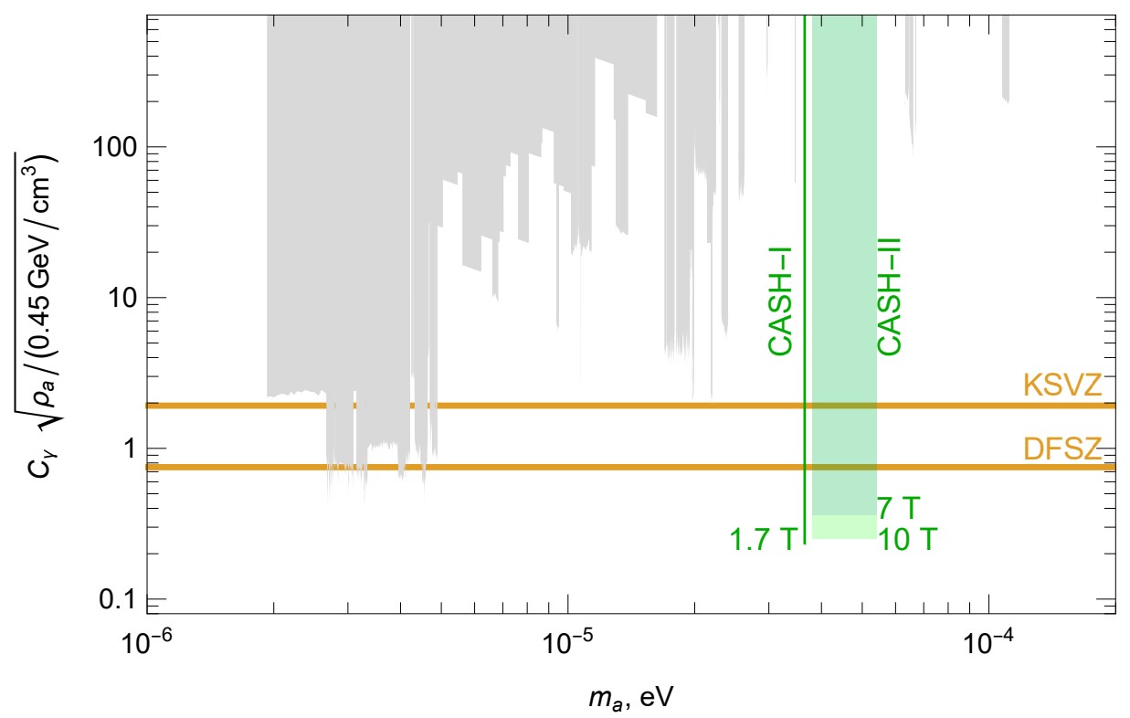 Проект CASH будет реализован в два этапа. На первом этапе, CASH-I, будет использована не перестраиваемая медная полость и магнит с полем 1.7 Тесла. Даже в этой конфигурации, работая на фиксированной частоте, эксперимент всего за 12 дней наблюдений сможет достичь чувствительности, превосходящей все существующие аналоги в данной области масс. Второй этап, CASH-II, предполагает использование более мощного магнита (до 10 Тесла) и внедрение системы перестройки частоты резонатора. Это позволит в течение года просканировать ранее недоступный диапазон масс аксионов от 38 до 54 микроэлектронвольт с чувствительностью, достаточной для проверки самых пессимистичных теоретических моделей. Как наглядно демонстрируют графики из статьи, проект CASH сможет исследовать «белые пятна» на карте параметров аксиона, которые остаются вне досягаемости для других ведущих мировых экспериментов.