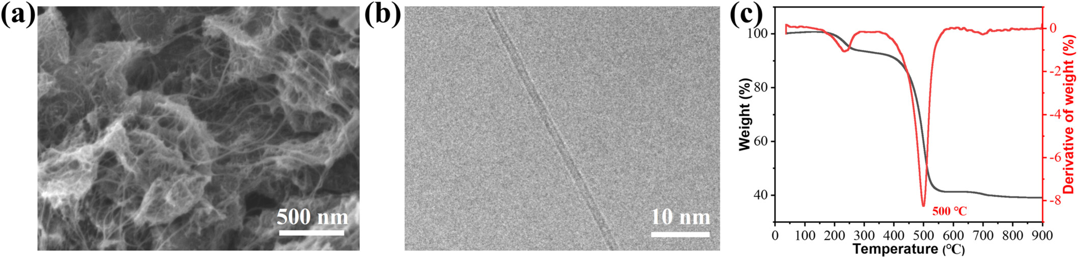 (а) Изображение с помощью сканирующего электронного микроскопа и (b) изображение с помощью просвечивающего электронного микроскопа углеродных нанотрубок, выращенных из натурального каучука при температуре 800 °C. Источник: Carbon Neutralization