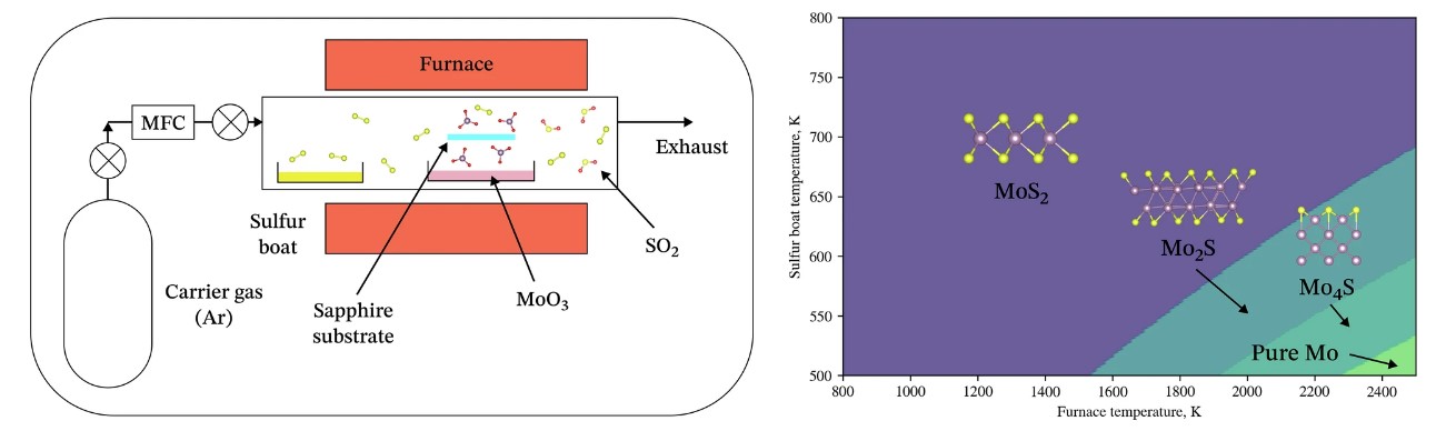 Схематическое изображение CVD-синтеза MoS2 с использованием прекурсоров серы и MoO3 (слева) и фазовая диаграмма двумерной системы Mo-S (справа). Источник: NPJ Computational Materials