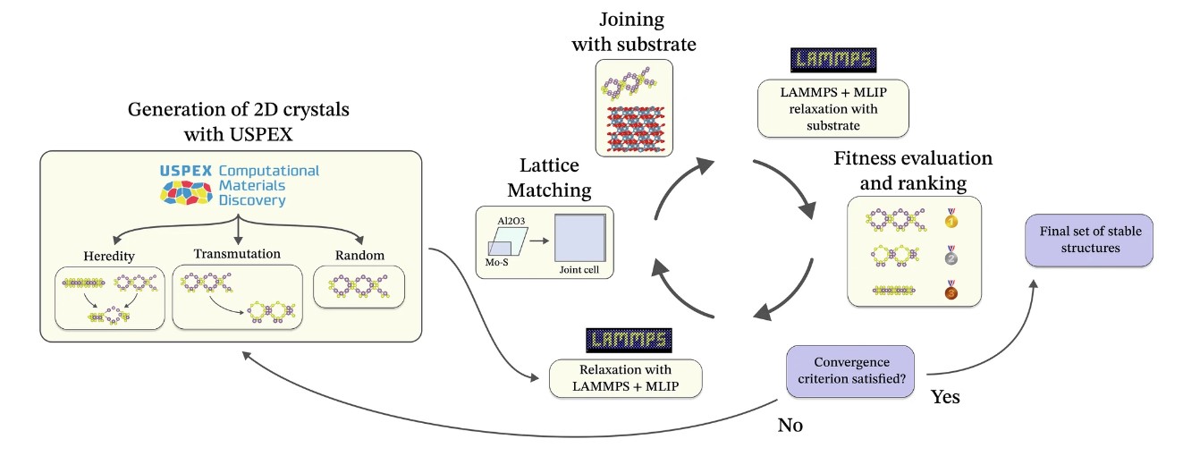 Принцип работы алгоритма: генерация вариантов материал—подложка, оптимизация их структуры с помощью межатомного потенциала на основе машинного обучения, выбор наилучших и окончательный анализ стабильной структуры.Источник: NPJ Computational Materials