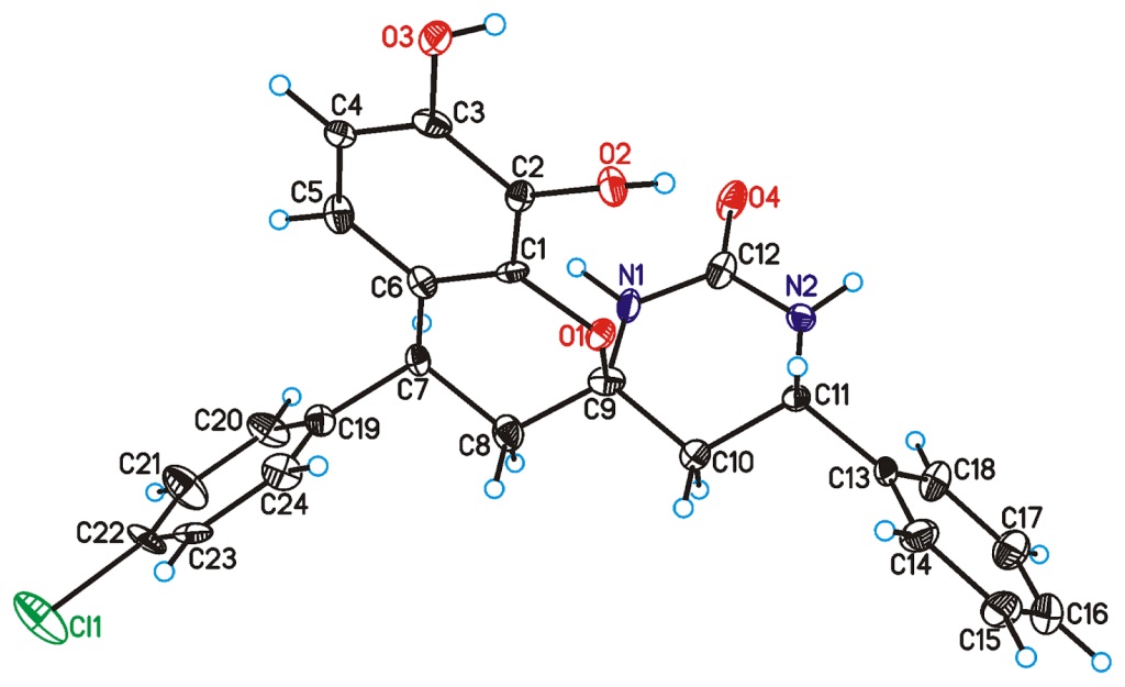 Общий вид соединения 5h. Для визуализации молекулы использована CPK-цветовая схема (C: углерод — серый, N: азот — синий, O: кислород — красный, Cl: хлор — зеленый).