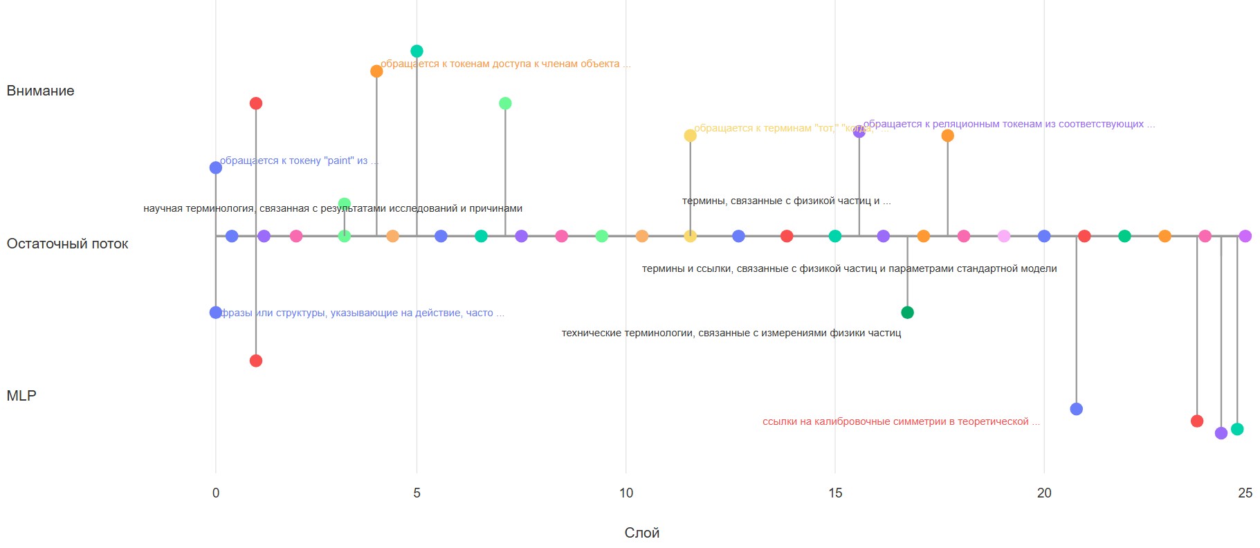 Рисунок 1. Механизм внимания. Этот граф потока, построенный с помощью нового метода, наглядно демонстрирует эволюцию одной-единственной концепции, связанной с научной физикой. Горизонтальная ось представляет собой глубину нейросети — от ранних слоев (слева) до финальных (справа). Каждая точка — это конкретное проявление этой концепции на определенном слое, а линии показывают ее «наследование». Видно, как на ранних этапах появляются общие научные термины, а по мере продвижения вглубь модели они уточняются и кристаллизуются в узкоспециализированные понятия, такие как «параметры стандартной модели». Источник: Daniil Laptev et al. / ICML 2025.