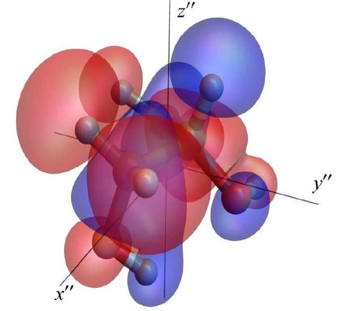 Рисунок 1. Трехмерный портрет хиральной молекулы. Изображение внешней электронной орбитали молекулы глицеральдегида (D-энантиомера). Красные и синие области показывают разные знаки волновой функции электрона. Именно с этой сложной, асимметричной структуры свет выбивает вихревой фотоэлектрон, который несет в себе информацию о ее «зеркальности». Источник: Physical Review A.