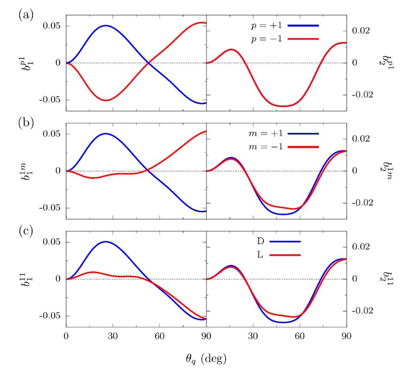 Рисунок 2. Тройная хиральная асимметрия в действии. Графики показывают, как «зеркальность» (хиральность) фотона, электрона и молекулы влияет на результат фотоэффекта. Расхождение между синими и красными линиями — это и есть предсказанная асимметрия. (a) Зависимость от хиральности света (правая/левая поляризация). (b) Зависимость от хиральности самого электрона (вращение по/против часовой стрелки). (c) Зависимость от хиральности молекулы (сравнение ее левой и правой «зеркальных» форм). Источник: Physical Review A.