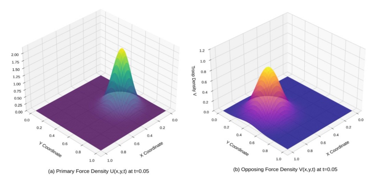 Рисунок 1. Пространственное распределение сил на поле боя, смоделированное с помощью новых уравнений. Верхний график (а) показывает, как атакующая группа (Primary Force) концентрируется в виде мощного локализованного «ударного кулака». Нижний график (b) демонстрирует, что силы противника (Opposing Force) в тот же момент времени имеют более рассредоточенную и слабую конфигурацию. Модель наглядно показывает самоорганизацию войск и формирование «горячих точек» в ходе боя. Источник: Journal of Applied Mathematics and Physics.