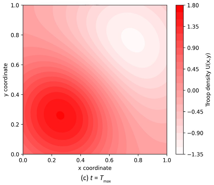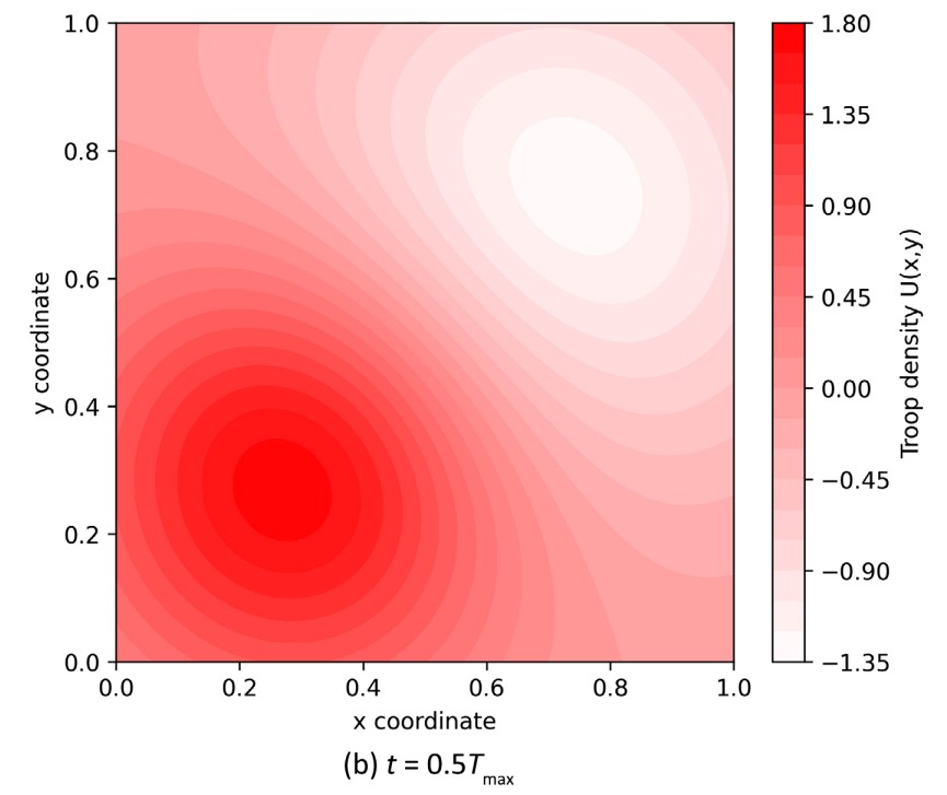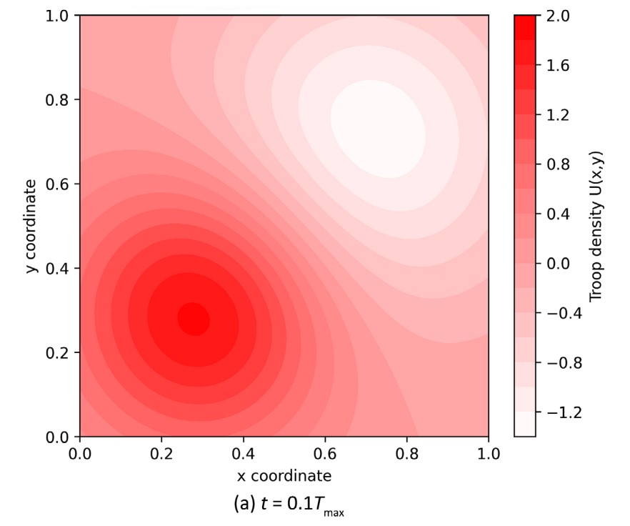 Чтобы преодолеть эти ограничения, Никита Борисов из Физтех-школы прикладной математики и информатики МФТИ предложил новый подход. Он представил поле боя как двумерное пространство, в каждой точке которого плотность сил двух противоборствующих сторон описывается системой уравнений реакции-диффузии. В этой системе, помимо классических членов, описывающих потери в бою (реакция), присутствуют и диффузионные члены, отвечающие за передвижение войск. Ключевое нововведение состоит в том, что коэффициент диффузии, то есть «подвижность» войск, не является постоянной величиной. Он нелинейно зависит от концентрации как своих, так и вражеских сил. Такой подход позволяет моделировать реалистичные тактические сценарии: например, высокая концентрация своих сил может облегчать логистику и увеличивать мобильность («эффект блицкрига»), в то время как присутствие противника, наоборот, сковывает передвижение («эффект сковывания»).