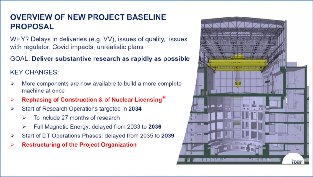 Сроки получения первой плазмы, планы по достижению максимально возможной энергии магнитного поля и переход к D-T фазе опять сдвинулись — среди причин можно выделить проблемы с качеством и ядерным регулированием, а также эпидемию ковида. Теперь старт исследований запланирован на 2034 год.