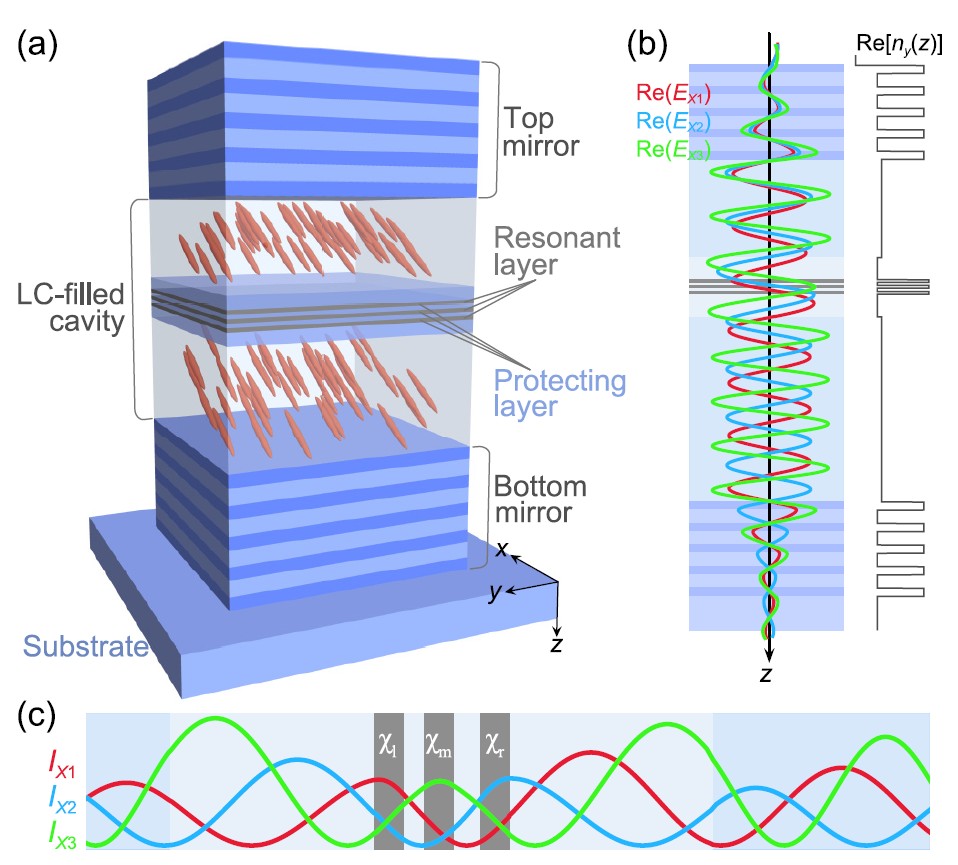 Чтобы преодолеть это ограничение и превратить «бронзу» в «глину», с которой можно работать в реальном времени, авторы исследования обратились к уникальным свойствам жидких кристаллов. Эти материалы, знакомые всем по экранам смартфонов и телевизоров, состоят из молекул, способных изменять свою ориентацию под действием внешнего электрического поля. Такое изменение, в свою очередь, меняет оптические свойства всего материала, в частности, его показатель преломления. Ученые предложили конструкцию, где полость оптического микрорезонатора заполнена жидким кристаллом, а внутри него размещены несколько тончайших слоев полупроводника на основе перовскита, который служит источником экситонов.