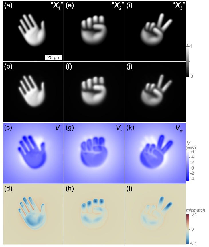 Чтобы продемонстрировать возможности своей платформы, исследователи провели численное моделирование, поставив перед алгоритмом топологической оптимизации амбициозную задачу. В качестве целевых изображений были выбраны три сложных узора, сгенерированных нейросетью: раскрытая ладонь, сжатый кулак и рука, которая показывает знак победы (V). Алгоритм успешно рассчитал необходимую наноразмерную модуляцию толщины экситонных слоев. Моделирование показало, что при одном значении управляющего параметра (угла наклона молекул жидкого кристалла) поляритонный конденсат действительно принимает форму ладони, при другом — кулака, а при третьем — знака V.