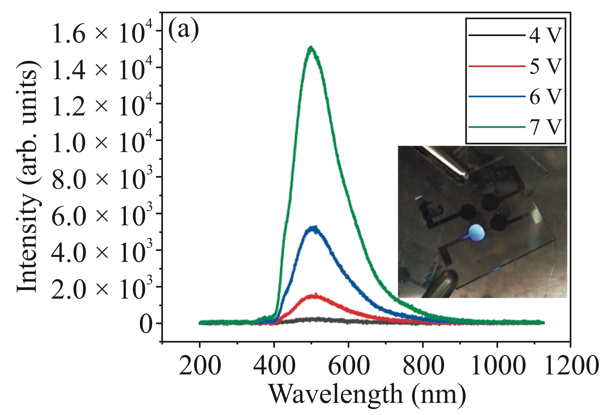 Рисунок. Спектр OLED-устройства на основе углеродных точек. Вставка: фотография ОСИД, излучающего голубой цвет. Источник: журнал «Письма в ЖЭТФ»
