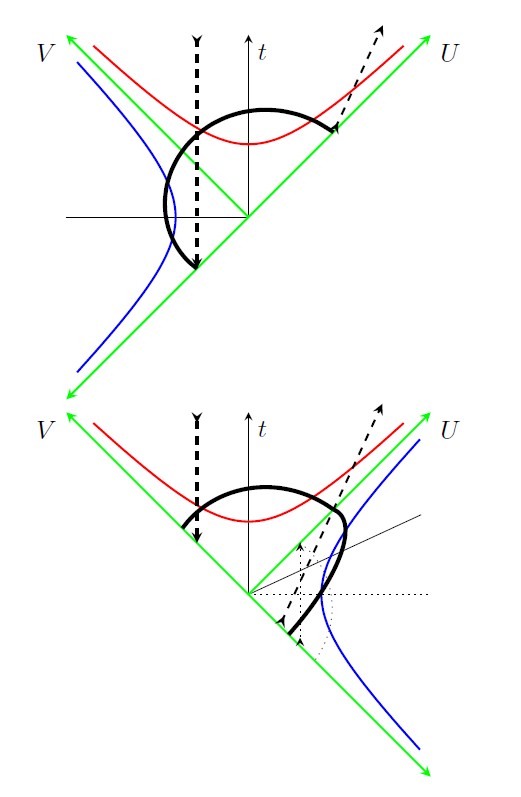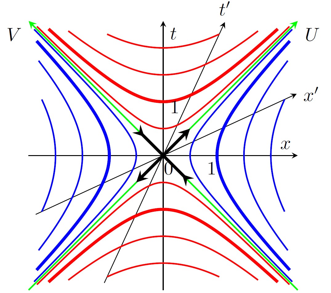 Рисунок 2. Игровое поле теории относительности: плоскость Минковского. В отличие от обычной карты, здесь есть четыре разных “территории”, разделенные световыми лучами (диагональные линии U и V). Времениподобные секторы (“будущее” и “прошлое”) содержат траектории объектов, движущихся медленнее света, а пространственноподобные (“право” и “лево”) — события, недосягаемые друг для друга. Преобразование Лоренца (буст) не вращает, а “сжимает” и “растягивает” эту плоскость вдоль световых лучей, что и лежит в основе классификации новых сингулярностей. При этом точки скользят вдоль кривых. Источник: ЖЭТФ, 2025, том 168, вып. 2 (8), стр. 185.