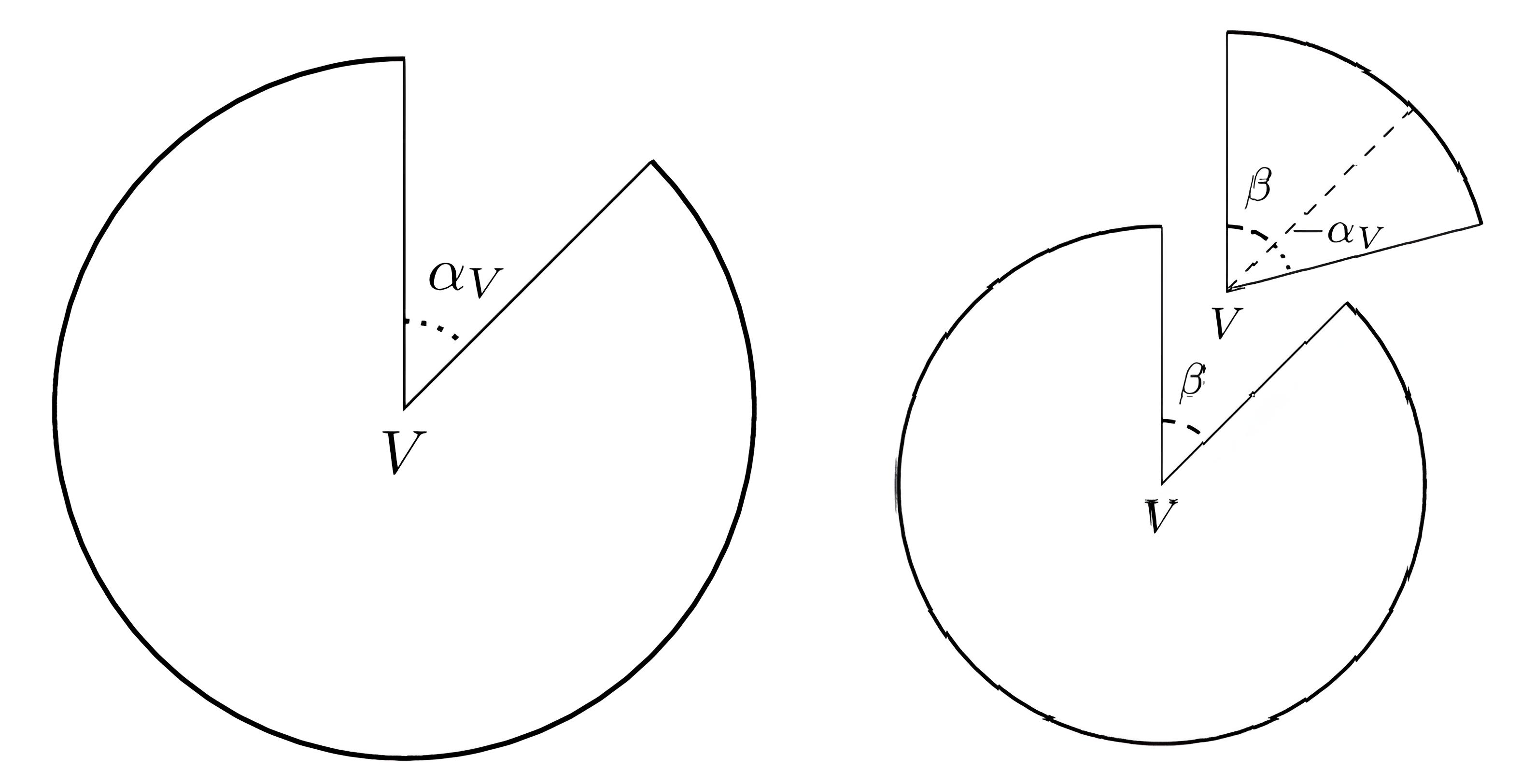 Рисунок 1. Основа основ: коническая сингулярность в обычном пространстве. Слева: если из плоского диска вырезать сектор (дефицит угла αV) и склеить края, в центре V образуется вершина конуса, где концентрируется вся кривизна. Справа: если, наоборот, вклеить дополнительный сектор (избыток угла), получится “седловая” поверхность. Этот простой принцип лежит в основе исчисления Редже, моделирующего сложное искривленное пространство-время с помощью набора таких плоских “кусочков”. Источник: ЖЭТФ, 2025, том 168, вып. 2 (8), стр. 183.