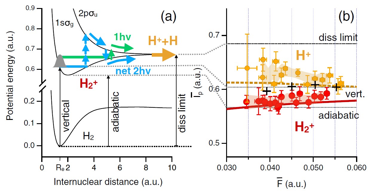 Полученные данные не только показали, что эффективная энергия ионизации водорода в сильном поле заметно отличается от своего стандартного значения, но и выявили еще более тонкий эффект. Оказалось, что эта энергия разная для двух разных сценариев распада: когда молекула водорода просто теряет электрон, превращаясь в ион H₂⁺, и когда она разрывается на два протона и электрон (H⁺ + H).