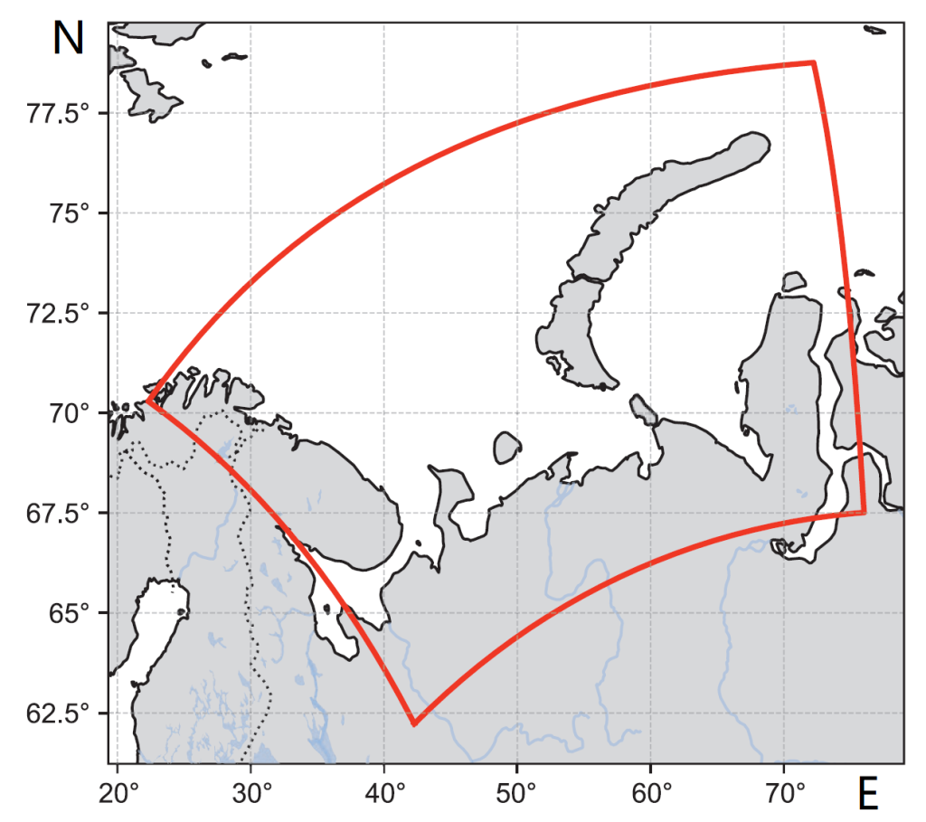 Рисунок 1 Вычислительная область, в которой проводится статистическое масштабирование приповерхностного ветра. Источник: «Океанологические исследования»