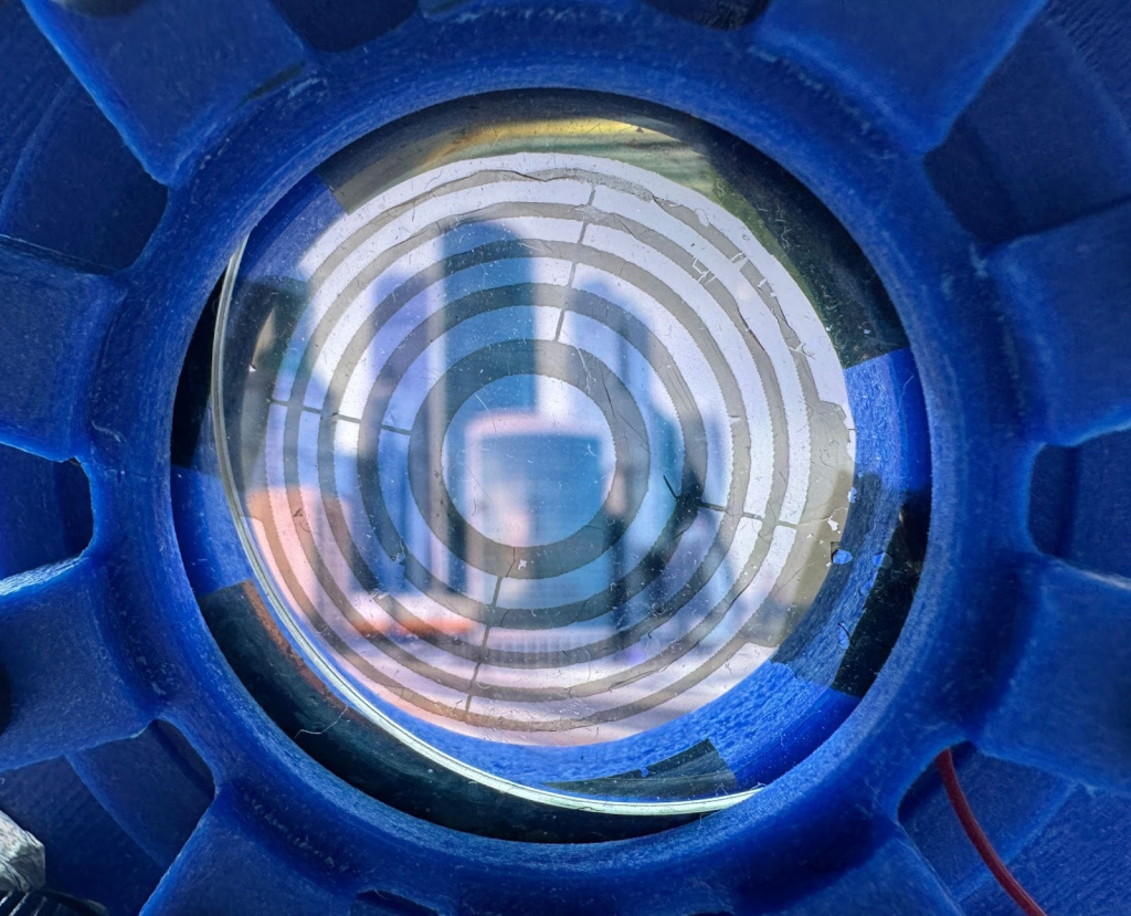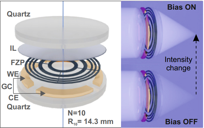 Чтобы преодолеть эти ограничения, учёные создали ультратонкую и гибко настраиваемую линзу на основе углеродных нанотрубок. В ее основе лежит зонная пластина Френеля, интегрированная в электрохимическую ячейку: между двумя кварцевыми пластинками заключён тонкий слой ионной жидкости и плёнка из нанотрубок с нанесённым на нее рисунком из концентрических колец. Изнутри к ней подключены контакты из золота, которые работают как электроды.