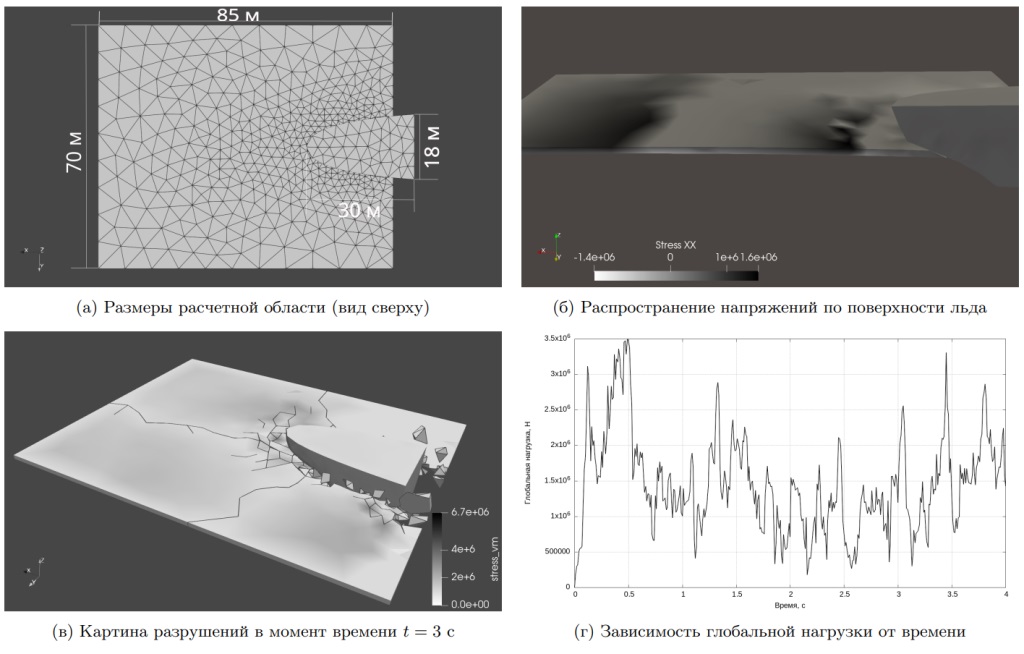 Модель уже прошла валидацию на двух типах задач: ударном взаимодействии с большой энергией и медленном продавливании льда массивным объектом. Для расчетов использовались реальные физические параметры льда из экспериментальных данных и сравнивались характеристики разрушения при разных скоростях взаимодействия.