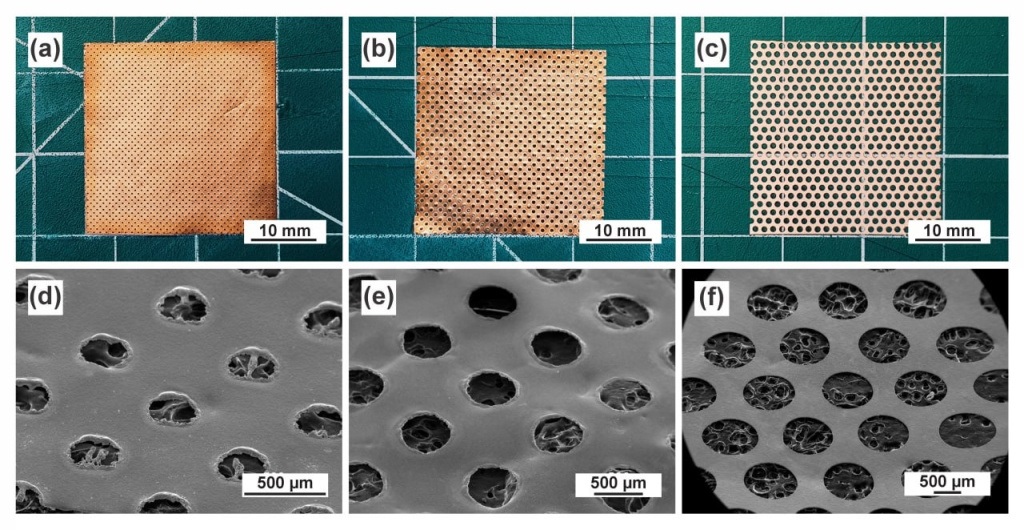 Медная фольга после перфорации лазерным оборудованием с отверстиями диаметром от 250 до 500 мкм. Источник: Journal of Composites Science